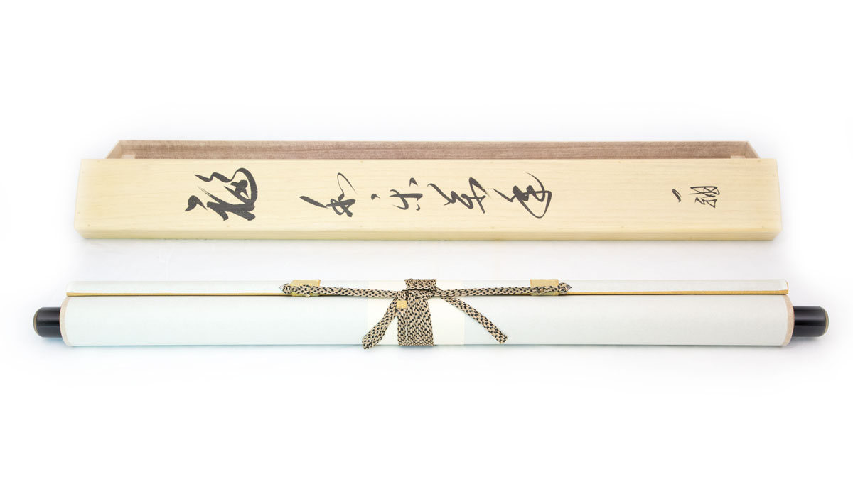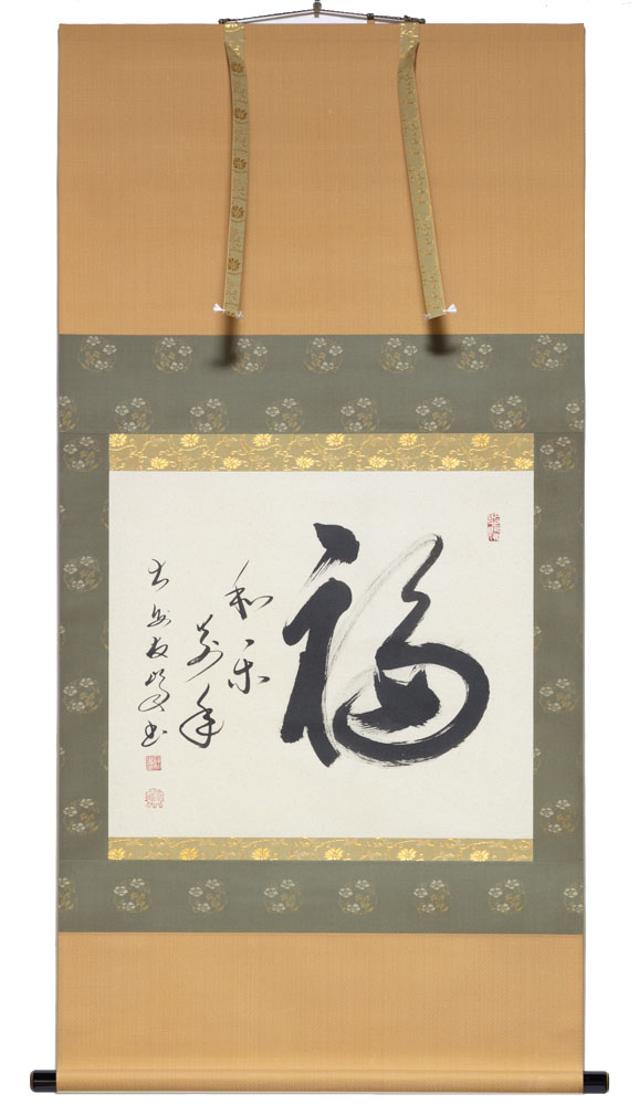 represent, in effect, a comment on the theme of “blessings,” or a more detailed description of what those entail. The two characters wa (和) and raku (樂), translated here as “peace” and “happiness,” can also be rendered as “harmony” and “ease” or “pleasure,” respectively. The final two characters — mannen (萬年) — are translated here as “forever,” but the literal meaning is “ten thousand years.”