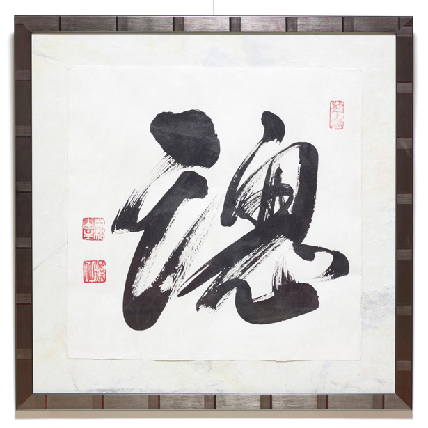 Standing alone as it does in the present work of Zen calligraphy, however, the word “spirit” is best interpreted as the “life force” or “animating spirit.” It is something akin to what, in modern terms, is called the “autonomic nervous system”: an active principle that keeps us alive (breathing, heart pumping, etc.) even when asleep, unconscious, or otherwise oblivious to those basic functions. Zen teaches that human beings are so caught up in linguistic constructs and conceptual thinking that we lose sight of the underlying “spirit” or “buddha nature”佛心