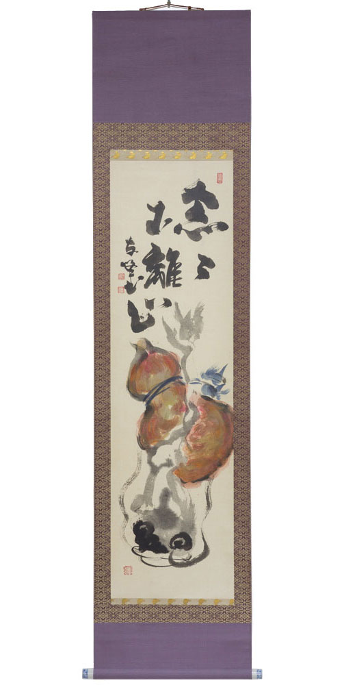 Master Takahashi uses the saying, “Thought after thought is not separate from mind,” to indicate that the deluded idea of awakening (symbolized by the “gourd” in the painting) occurs in the very same mind that may attain actual awakening (the “fish” in the painting). His painting, too, juxtaposes the gourd and the catfish in a much more intimate way than the painting by Josetsu. In fact, his gourd looks like it may have actually caught the fish!
